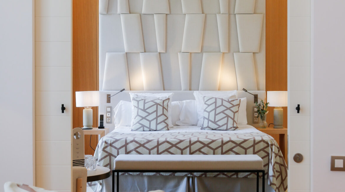Tanto el panelado de pared como el cabecero que combina elementos tapizados de diferente geometría repiten el patrón de alfombras y cojines.