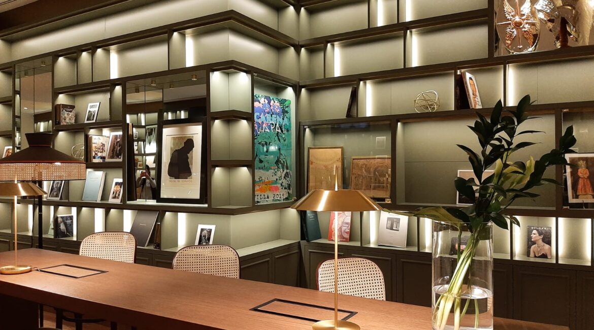 Los elementos de las zonas de alimentación, la monumental estantería y mostrador de recepción, la barra y pared tapizada de la abacería, sofás y mesas auxiliares y un sinfín de elementos fabricados por Bagon Muebles habitan este espacio singular en la capital andaluza.